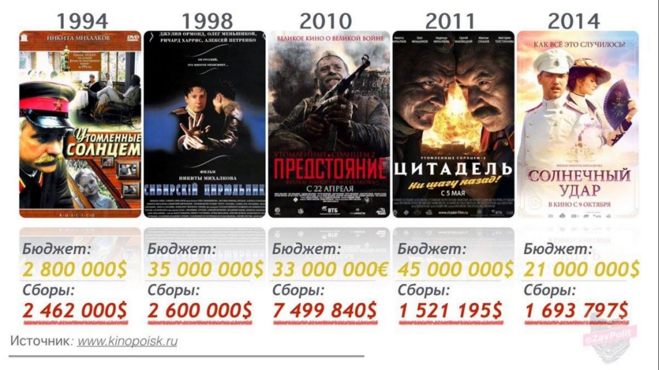 «Для меня стало большой радостью, что люди стали ходить на российское кино, потому что оно перестало их «чморить» и опускать на дно. Самые кассовые картины за прошедшие с предыдущего съезда (Союза кинематографистов) годы – это, по сути, советское кино: в нем существует вера, надежда и любовь, мне кажется, что на сегодняшний день мы начинаем выходить из тяжелого кризиса», – передает РИА «Новости» слова Михалкова.