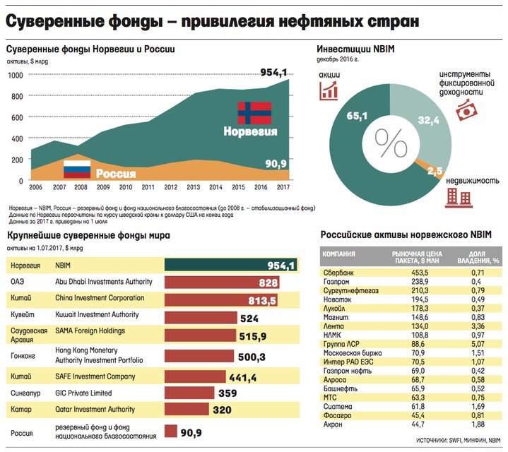 -Население Норвегии составляет 5,2 млн человек, т. е. на одного норвежца приходится более $192 000 активов фонда. В 2016 г. половину дохода NBIM принесли инвестиции, 45% – поступления от продажи Норвегией нефти и газа, остальное – курсовая разница валют